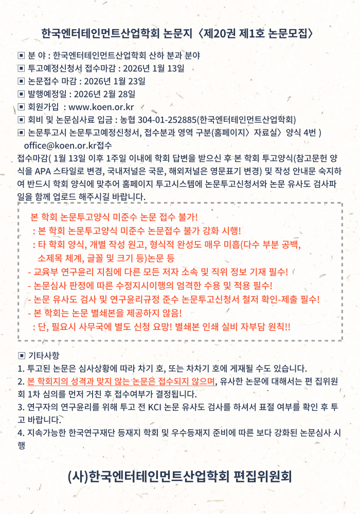 한국엔터테인먼트산업학회 논문지〈제19권 제4호 영문 논문모집〉