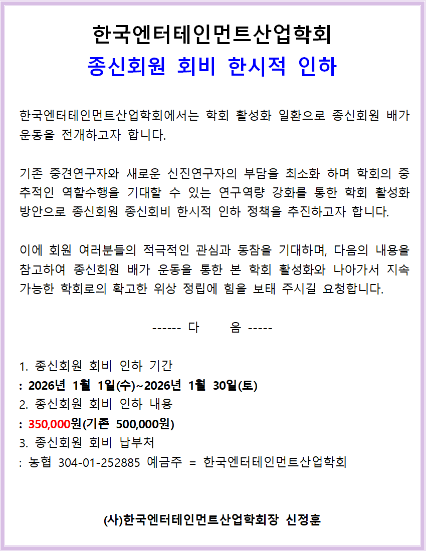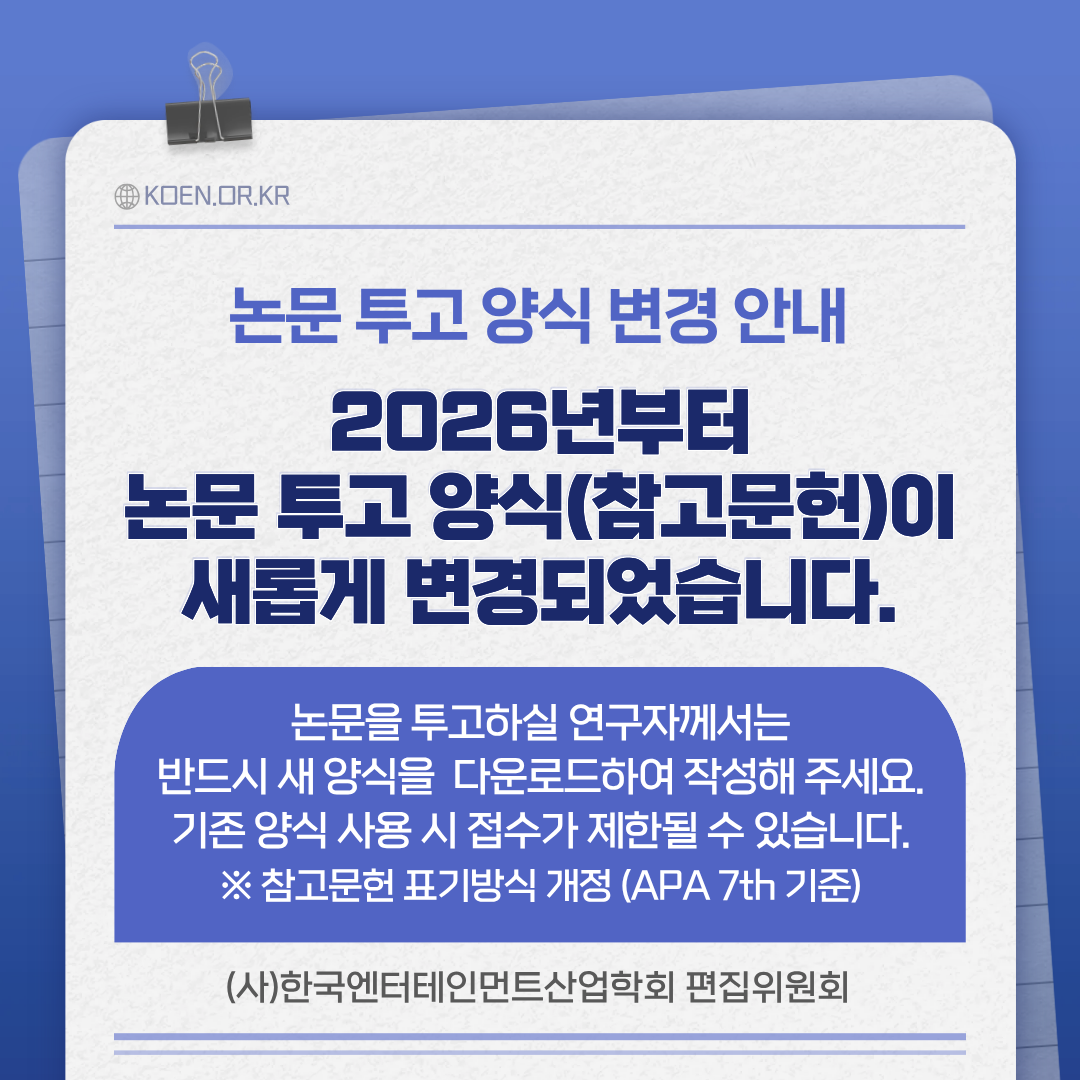 한국엔터테인먼트산업학회 논문지〈제19권 제4호 영문 논문모집〉