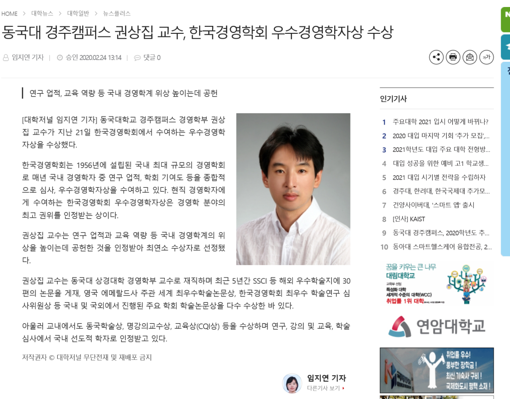 권상집 편집위원님 한국경영학회 최연소 우수경영학자상 수상