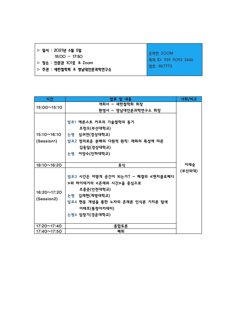 ▷ 일시 : 2021년 6월 5일 15:00 ~ 17:50 ▷ 장소 : 인문관 101호 ▷ 주관 : 새한철학회 & 영남대인문과학연구소 |