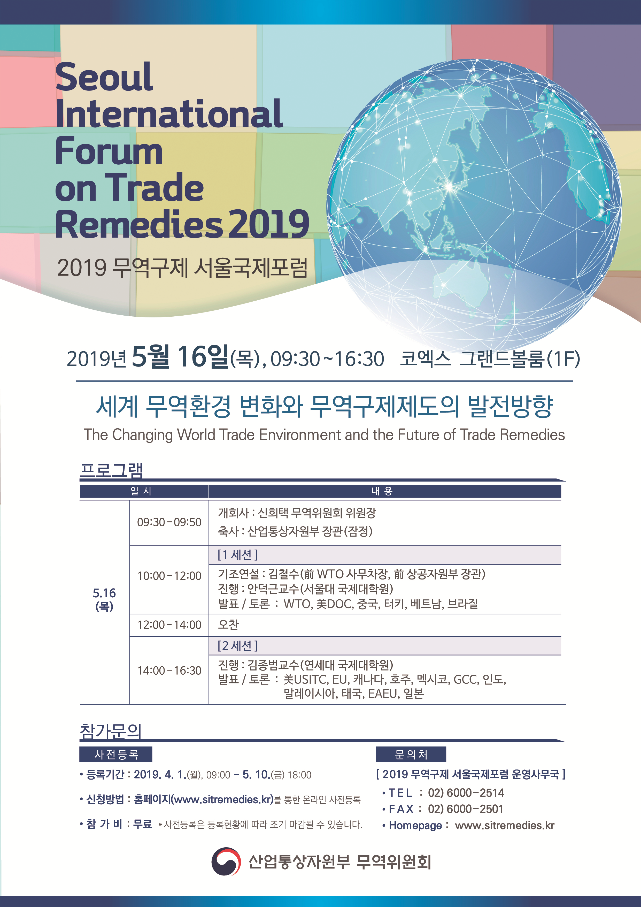 참 석 자: 산업통상자원부장관, 무역위원회위원장, WTO·미국·캐나다·중국·베트남·호주 등 세계 무역구제기관 대표 및 국내외 무역구제 전문가